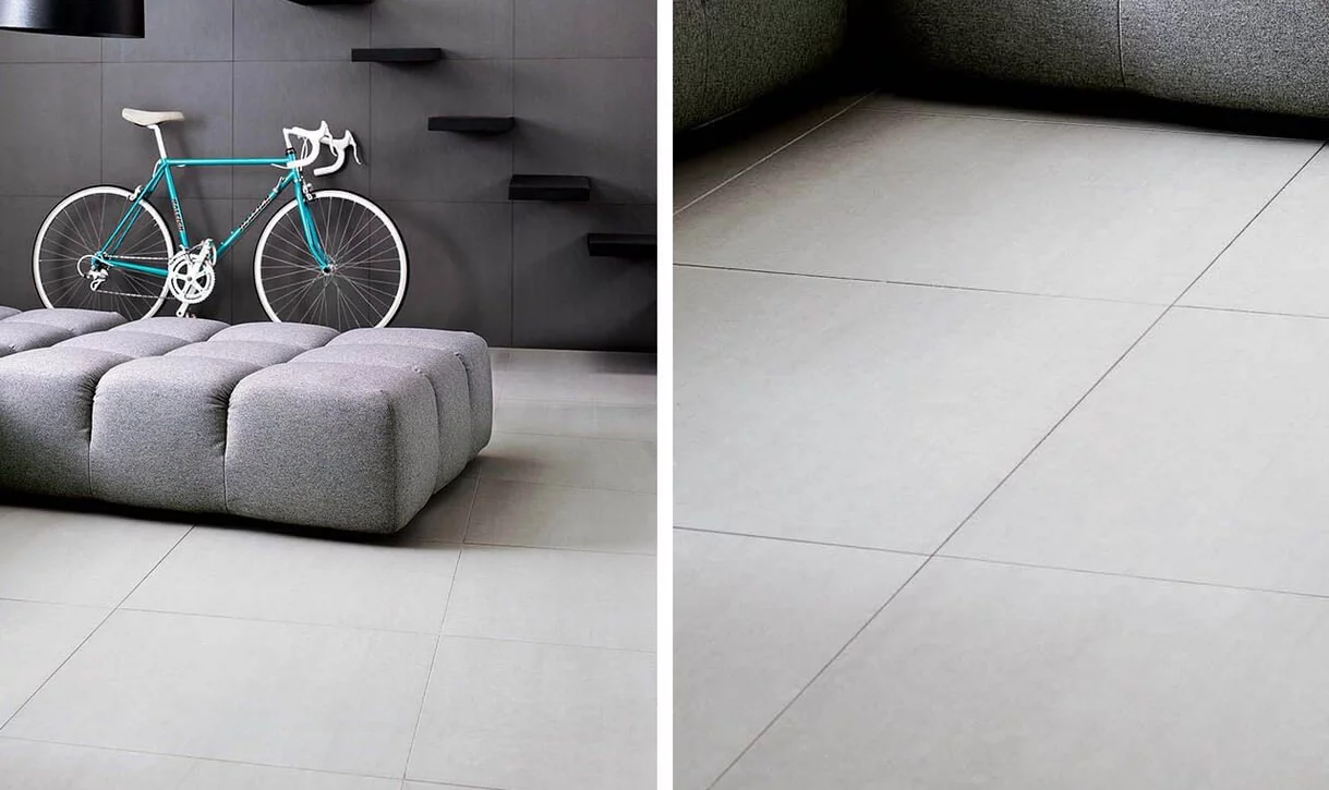 Rozpiętość barw od bieli do czerni idealnie pasuje do minimalistycznych wnętrz. Nowoczesny salon z ogromnym oknem, zaaranżowano wielkoformatowymi płytkami – jasnoszarymi na podłodze, a grafitowymi ze strukturą na ścianie. Dodatek czerni schodów, lampy i stolika dodaje salonowi wyrazistości.