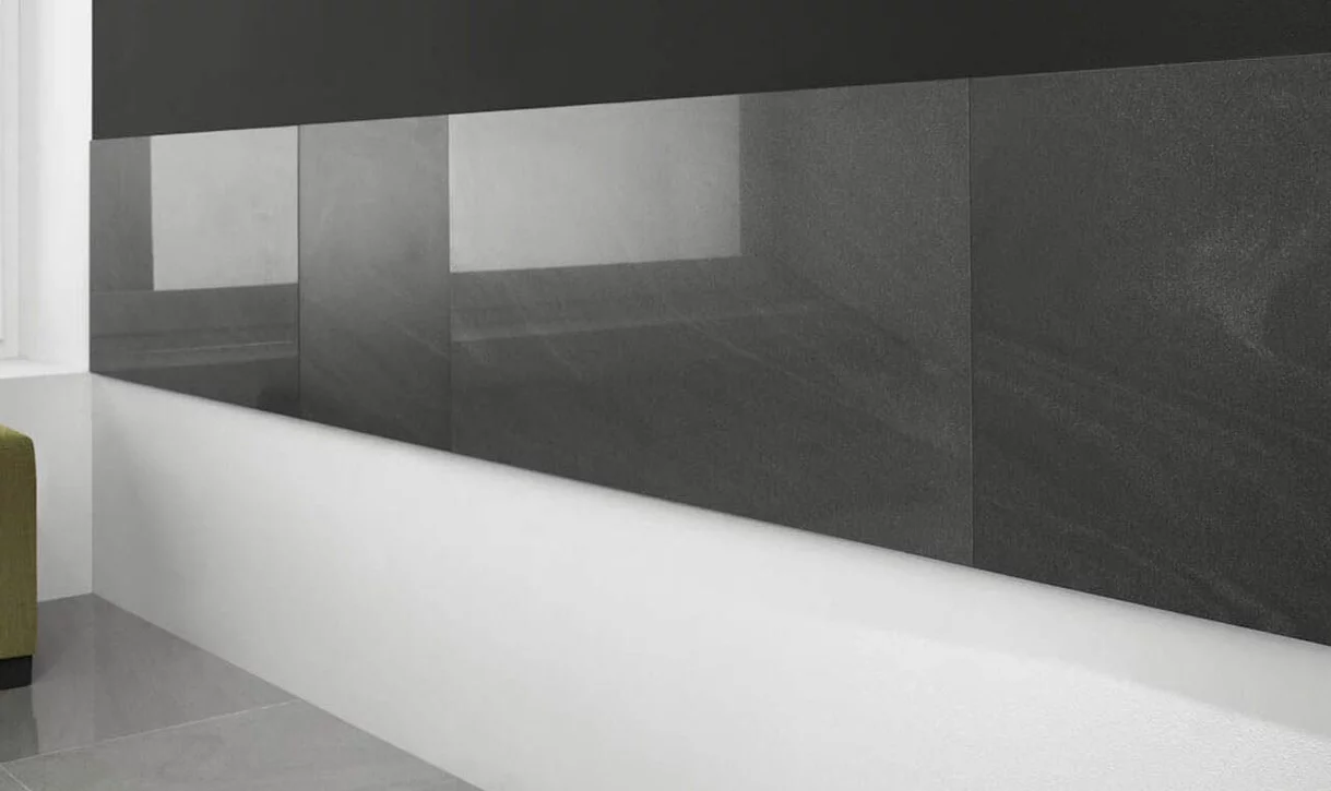 Ciemny grafit polerowanych płytek niczym w lustrze odbija światło. Ciemnoszare duże prostokąty ceramiczne, zestawione na przemian z matowymi kwadratami, tworzą rytmiczny, dekoracyjny efekt w minimalistycznym wnętrzu.