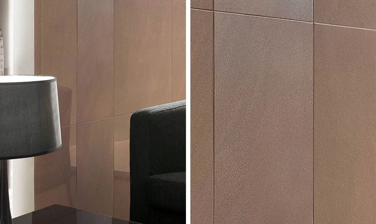 Ciemne barwy dodają prestiżu, dlatego gabinet zaaranżowany z wykorzystaniem wielkoformatowych płytek o barwie gorzkiej czekolady, wygląda niezwykle dostojnie i elegancko. Zróżnicowanie powierzchni płytek (mat-poler), tworzy dodatkowe efekty dekoracyjne.