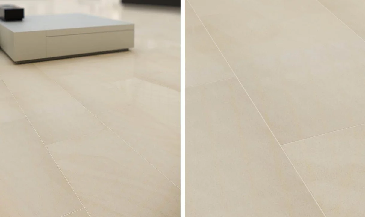Wielkoformatowe prostokąty o barwie piasku, matowej oraz polerowanej powierzchni, są podstawą aranżacji i jednocześnie główną ozdobą salonu urządzonego w stylu minimalistycznym.