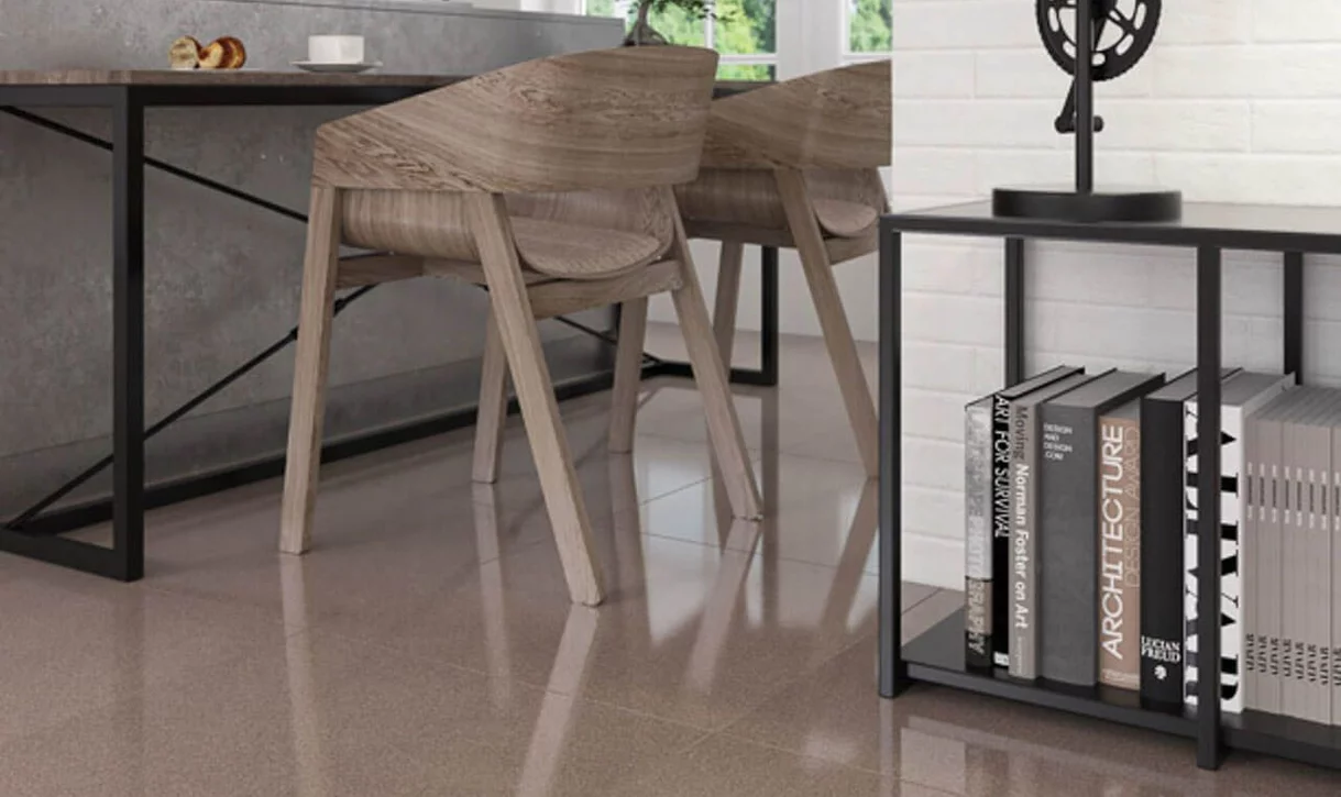 Jednolita tafla ciemnobeżowej, lekko błyszczącej podłogi, podkreśla surowy charakter loftowego wnętrza z metalowymi meblami. Naturalne drewno krzeseł współgra z ciepłą barwą wielkoformatowych, rektyfikowanych płytek.