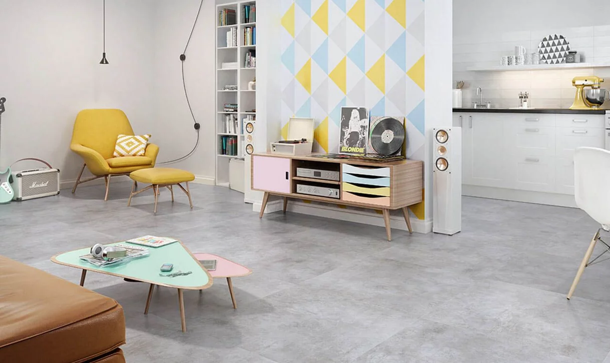 Salon dla ludzi młodych, choćby tylko duchem. Neutralne, „betonowe” szarości wielkoformatowych płytek podłogowych, pozwalają na częste zmiany pozostałych elementów aranżacji, zgodnie z kształtującym się gustem i duchem czasu.
