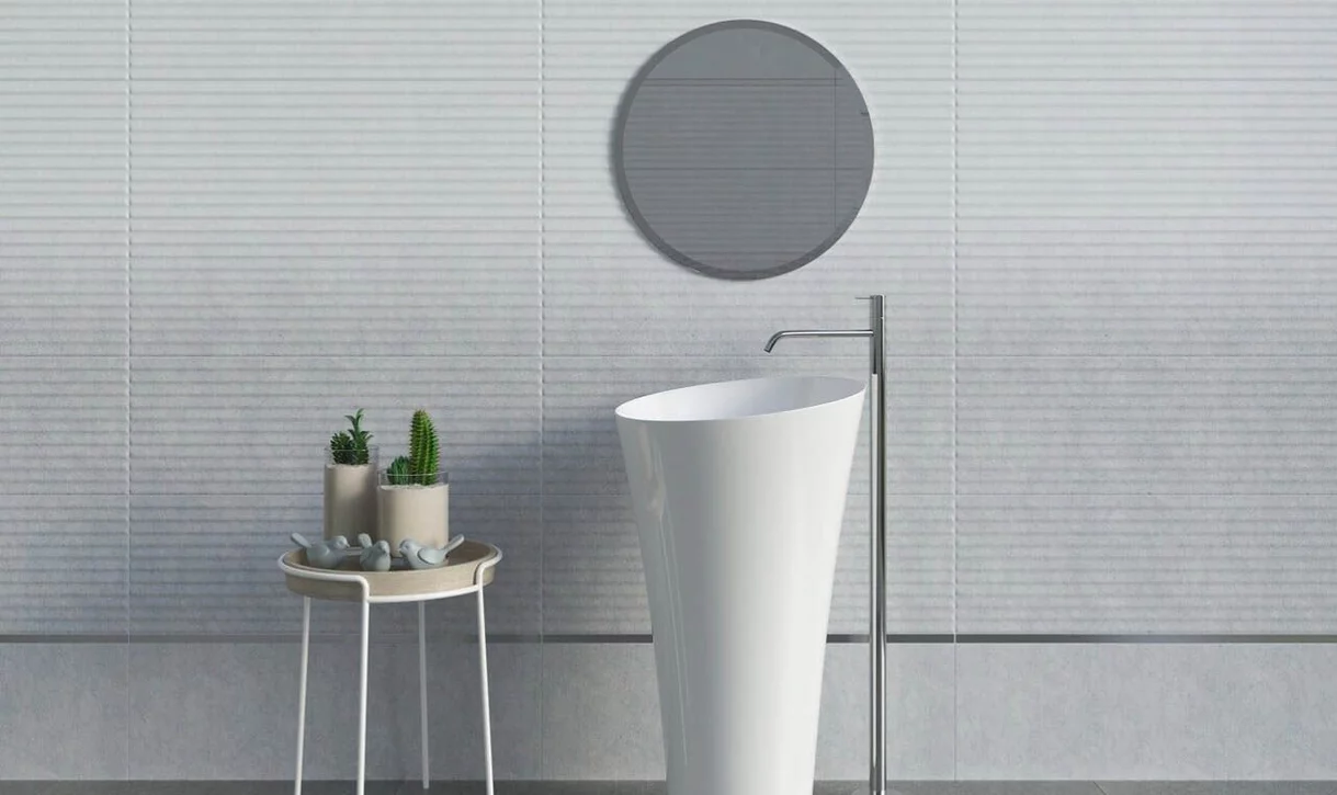 Wprawny dekorator wnętrz, w prostych liniach żłobień płytek ceramicznych dostrzegł potencjał gry "w kółko i kreskę". Paski ceramicznej struktury oraz uniwersalnych listew, wchodzą w ciekawą interakcję z okrągłymi formami lustra, umywalki i stołka. Całość jest szalenie wymowna i elegancka.