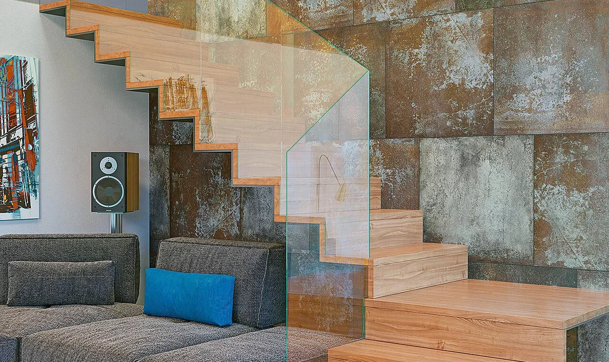 Zbliżenie na fragment nowoczesnego salonu ze schodami pokazuje efektowną ceramiczną ścianę. Metaliczne refleksy ożywiają brązowo-rdzawą powierzchnię. Rysunek każdej płytki jest niepowtarzalny. Szklana balustrada nie zakłóca linii schodów i nie przysłania pięknej ściany.