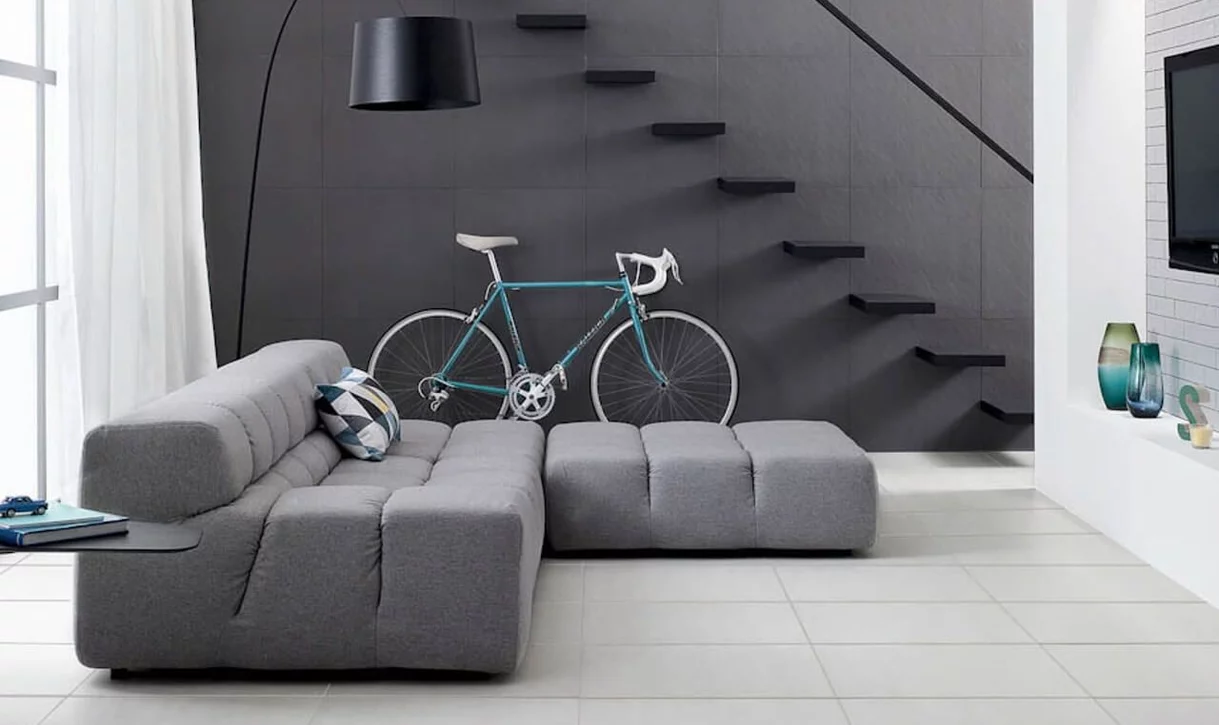 Jednolite szare płaszczyzny na ścianach i podłodze dają natychmiastowe wrażenie nowoczesności. Duże przeszklenia, prosta bryła sofy i minimalistyczne linie stopni schodowych, potęgują to wrażenie.
