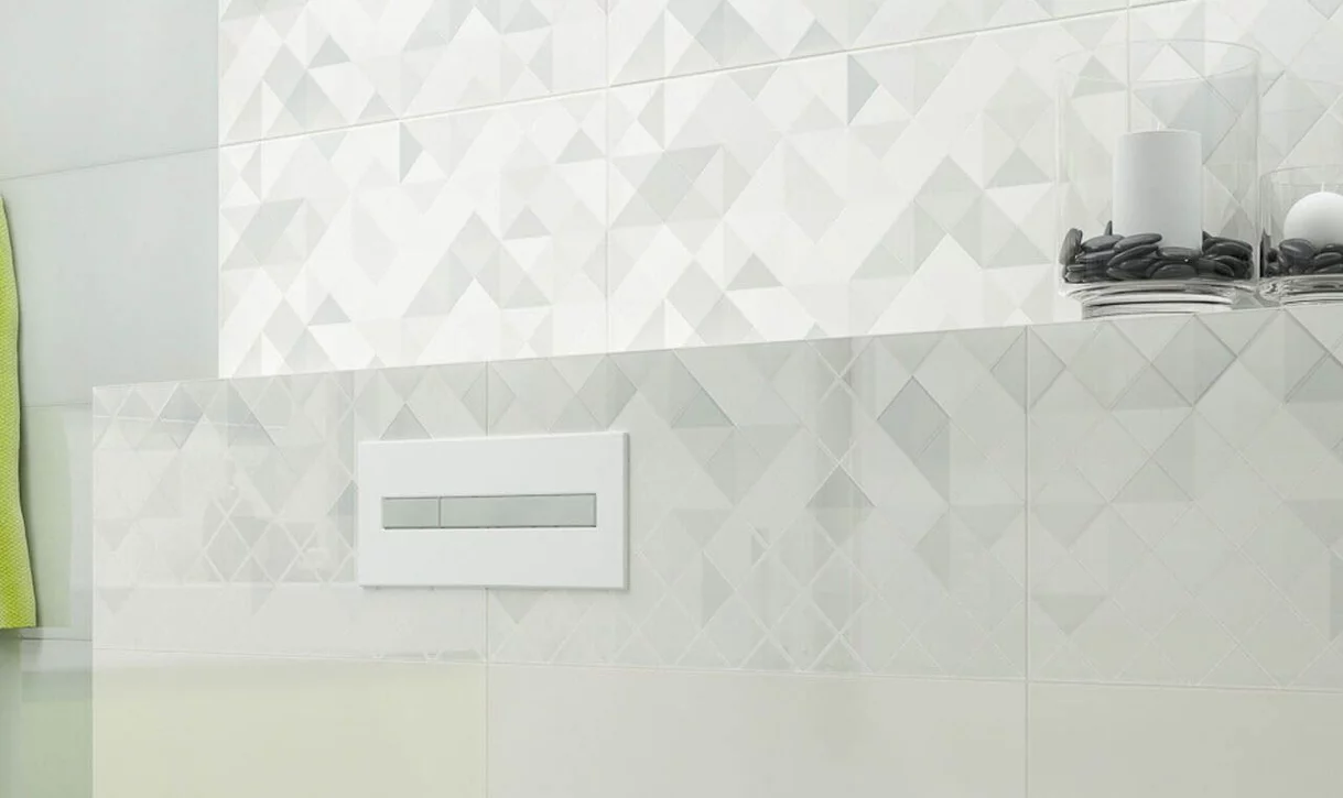 Białe i jasnoszare błyszczące płytki płynnie łączą się z subtelnymi wzorami płytek dekoracyjnych w kratkę i wzory geometryczne, inspirowane sztuką składania papieru. Całość daje wrażenie lekkości i świetlistości.
