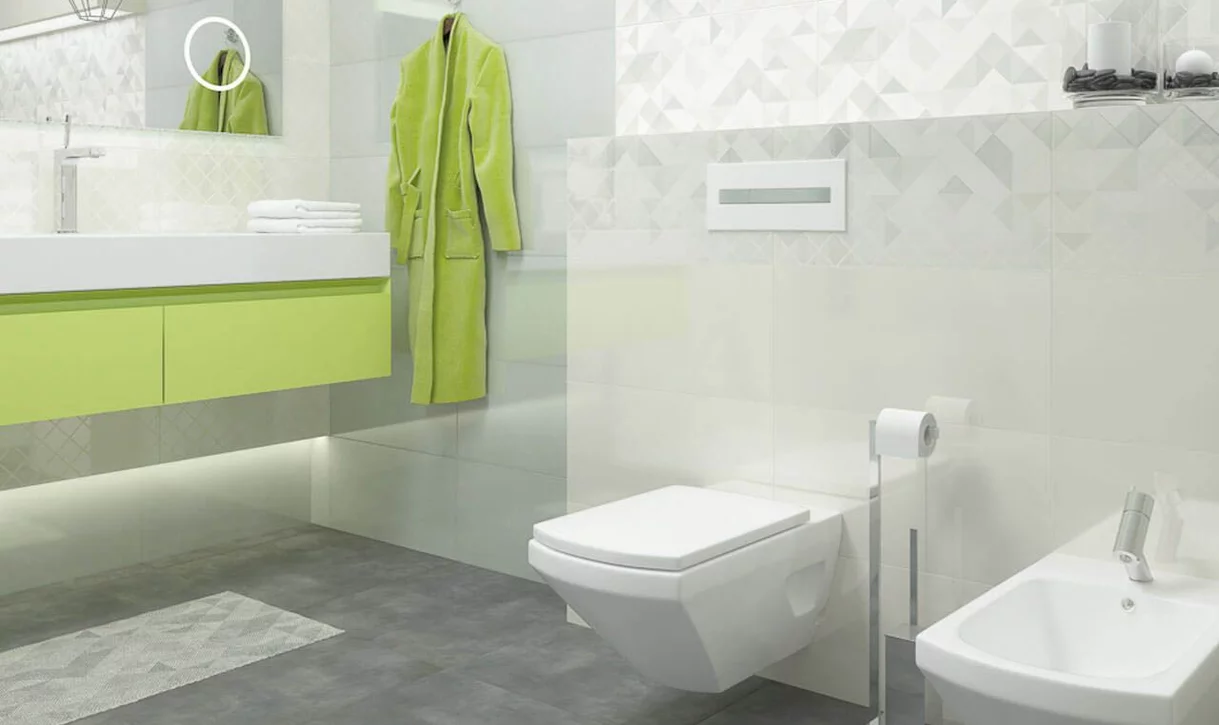 Błyszcząca powierzchnia jasnoszarych płytek odbija światło i powiększa wizualnie łazienkę. Grafika płytek jest zróżnicowana - od gładkich poprzez kratkę i subtelne wzory geometryczne, rodem ze świata origami. Minimalistyczna ozdobna wstawka w jednolicie szarej podłodze, dodaje łazience wdzięku.
