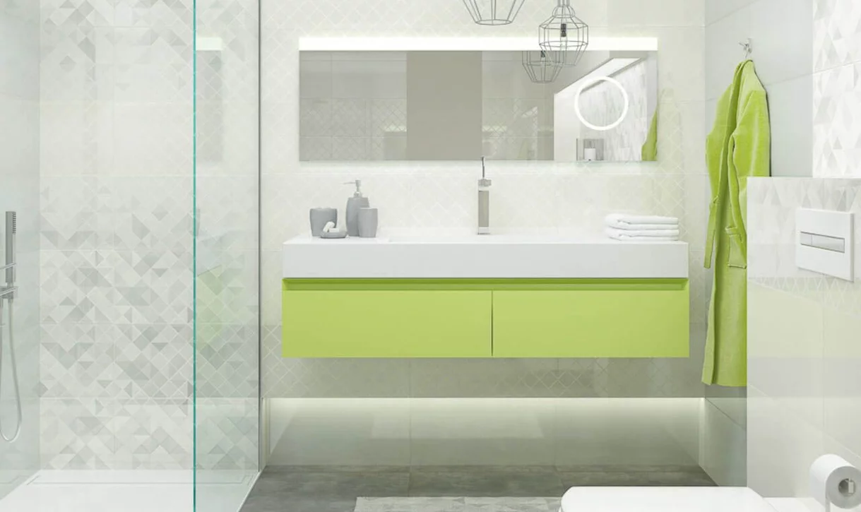Subtelna kratka i lekki, geometryczny wzór inspirowany sztuką origami, wnoszą do łazienki wrażenie porządku i spokoju. Neutralna szarość jest idealnym tłem dla wyrazistych dodatków, dzięki którym można z łatwością zmieniać charakter łazienki.