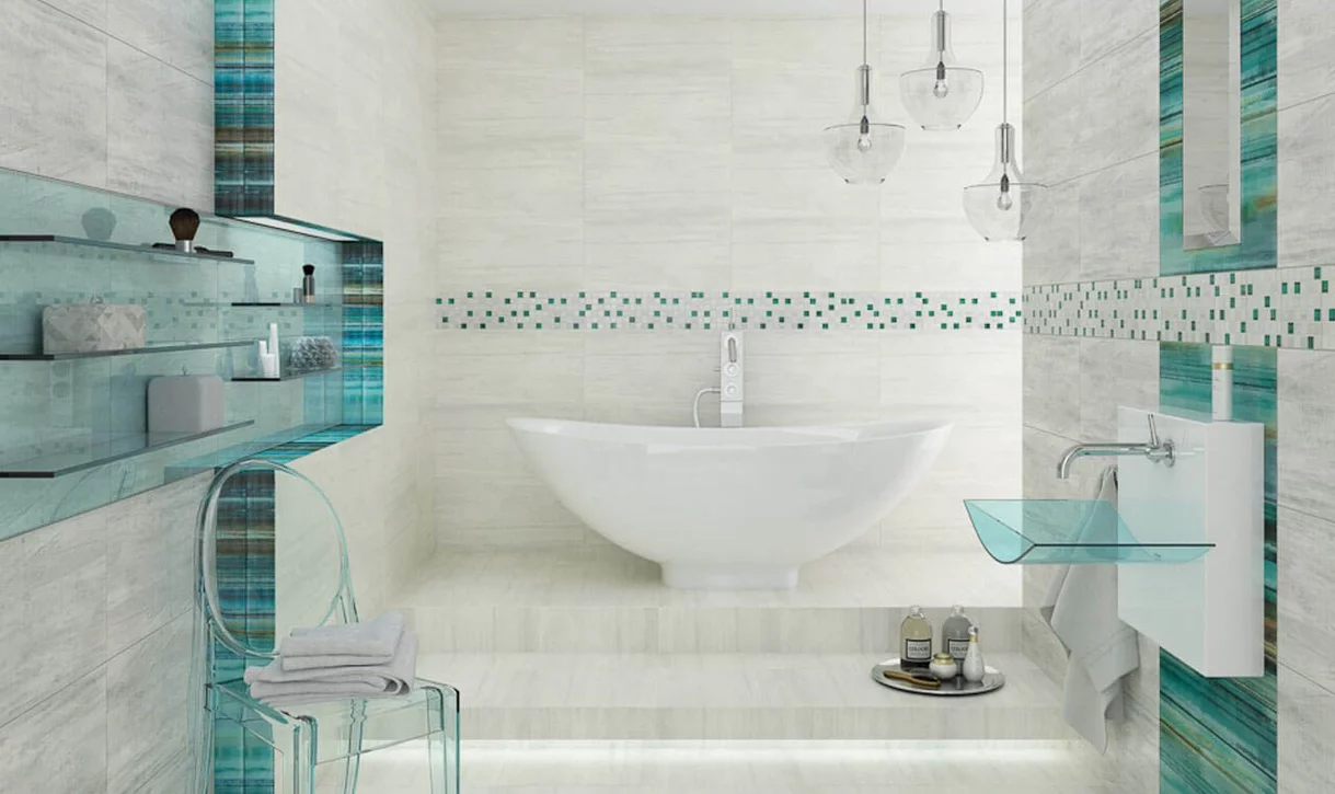 Świeżość, lekkość, powab i piorunujący efekt. Jasnoszare, matowe płytki bazowe są doskonałym, neutralnym tłem dla pięknych szklanych dekoracji. Ten dodatek sprawia, że łazienka pulsuje życiodajną energią. Konsekwentne stosowanie przezroczystych elementów wystroju nasyca pomieszczenie światłem.