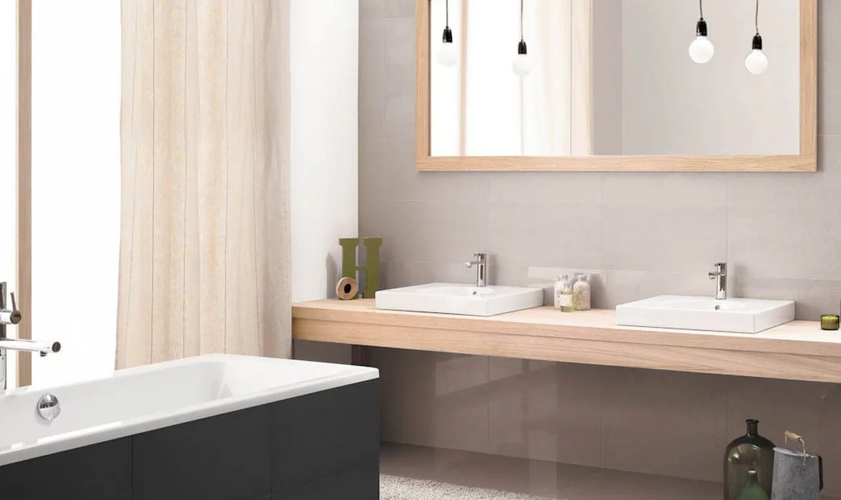 Styl nowoczesny może mieć całkiem przyjazną, niemal przytulną postać. Chłód szarych płytek, którymi obudowana jest wanna, został złagodzony blaskiem jasnej ściany, ciepłem naturalnego drewna i bawełnianej zasłony. Dodatki wnoszą kroplę koloru do łazienki.