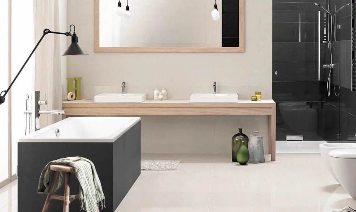 Przestronna łazienka w neutralnych bielach i szarościach. Proste formy wszystkich elementów wyposażenia - od prostych krawędzi mebli, poprzez ramę lustra i surowe oświetlenie - podkreślają kluczową rolę funkcji w minimalistycznym wnętrzu.