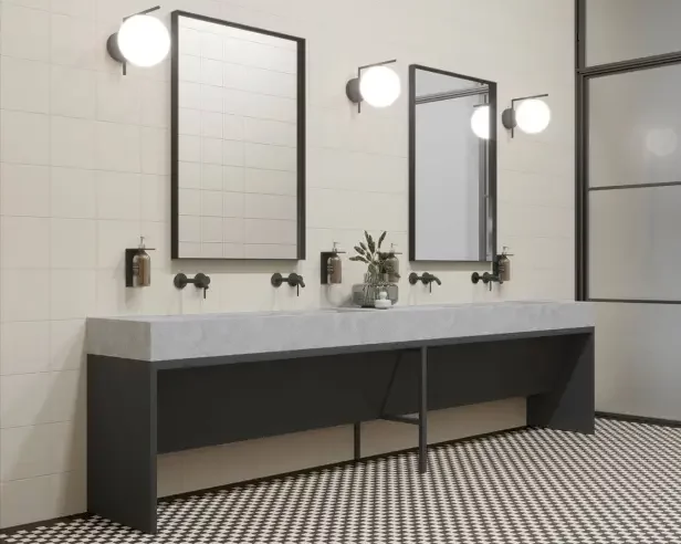 Tym razem pokażemy coś dla zwolenników minimalizmu i kontrastów black and white. Nawet w najnowocześniejszej łazience w przestrzeni publicznej, doskonale może się odnaleźć akcent retro – na przykład w postaci hipnotyzującej, czarno-białej posadzki z drobnych mozaikowych form. Zmiękczony kształt kostek (które nie są kwadratowe), wnosi nową jakość do surowych projektów. Białe płytki na ścianie w formie typowych „dwudziestek” (20×20 cm), podkreślą szlachetność posadzki. Na ich tle świetnie widoczne będą również loftowe, czarne baterie i lustra w metalowych ramach, a także industrialne lampy.