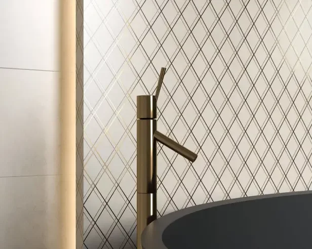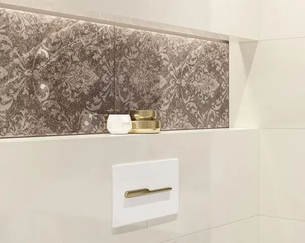 Zaaranżuj łazienkę wykorzystując błyszczące płytki (świetnie sprawdzą się te z ozdobnym wzorem).