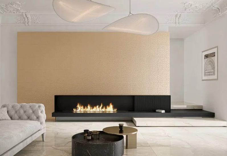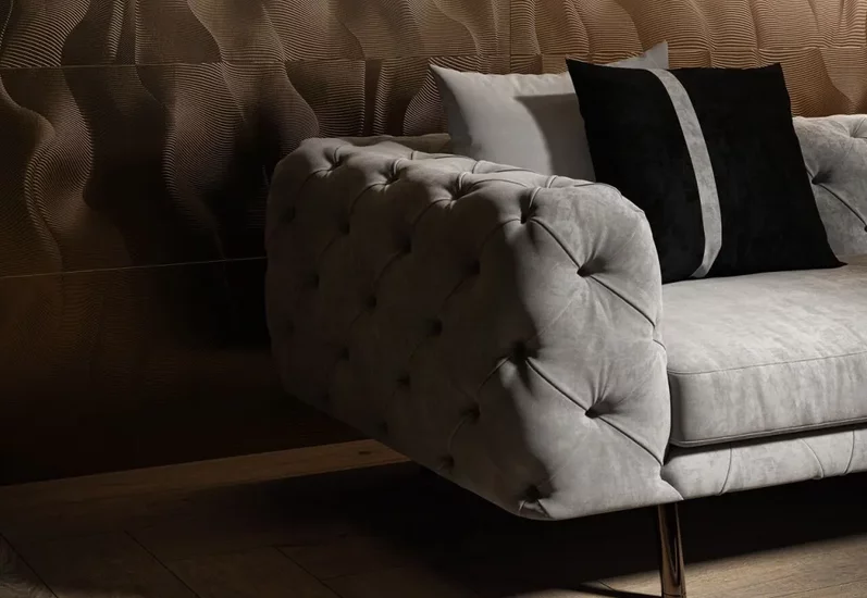 Tradycyjny motyw drewna na podłodze, tapicerowana, klasyczna kanapa i… złota, lśniąca ściana! Zaskakująco, takie połączenia są naprawdę zgrane i piękne.