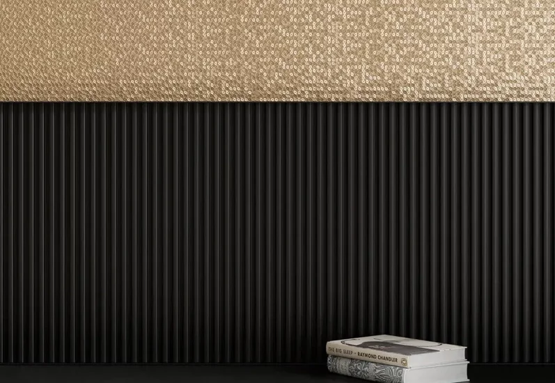 Innym rozwiązaniem jest dobranie złota i czerni. Ma ono zdecydowanie inny wydźwięk niż duet z bielą. Połączenie to jest dużo wyraźniejsze i bardziej kontrastujące. Dzięki temu możesz wydzielić w pomieszczeniu różne strefy, a na czarnej powierzchni ścian dokładnie uwydatnić złote dodatki. Na takim tle będą prezentować się niezwykle elegancko, zwłaszcza z odpowiednim oświetleniem.