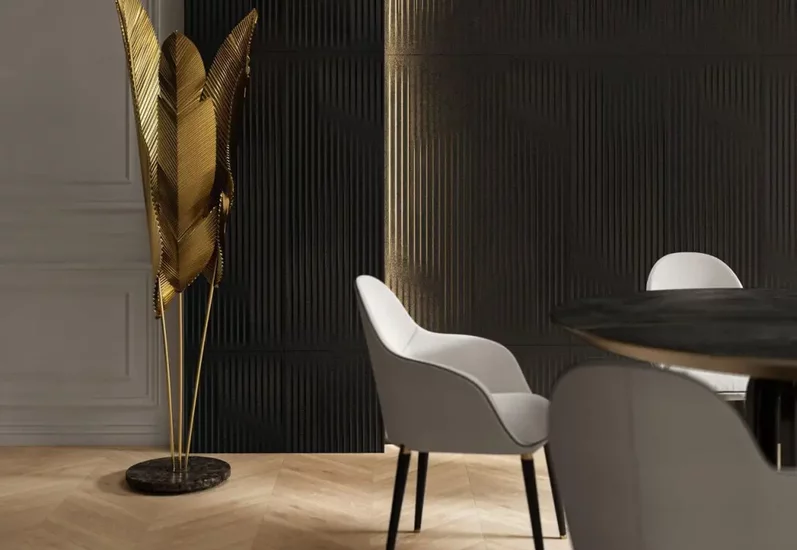 Równie pięknie, co nieoczekiwanie jawi się połączenie złota i srebra we wnętrzach nowoczesnych. Tu raczej spotykamy stonowane barwy lub wyraźne kontrasty, ale nie… srebrny kolor i złote dodatki! Okazuje się jednak, że to coraz częściej stosowane rozwiązanie. Pojawiają się one tutaj w postaci designerskich dekoracji, motywów na tapetach, obrazach lub płytkach ceramicznych oraz akcentów w meblach. Kolor srebrny jest zdecydowanym faworytem w nowoczesnych wnętrzach, ale jego złoty kompan pojawia się w nich coraz śmielej.