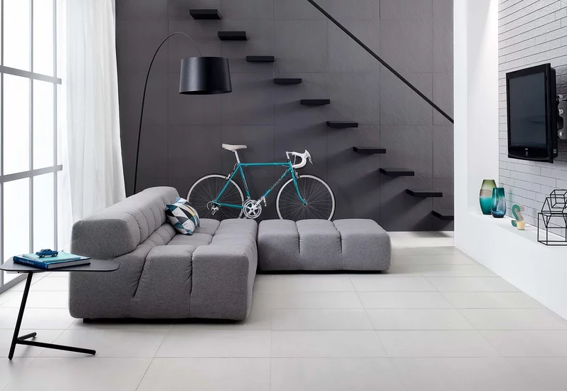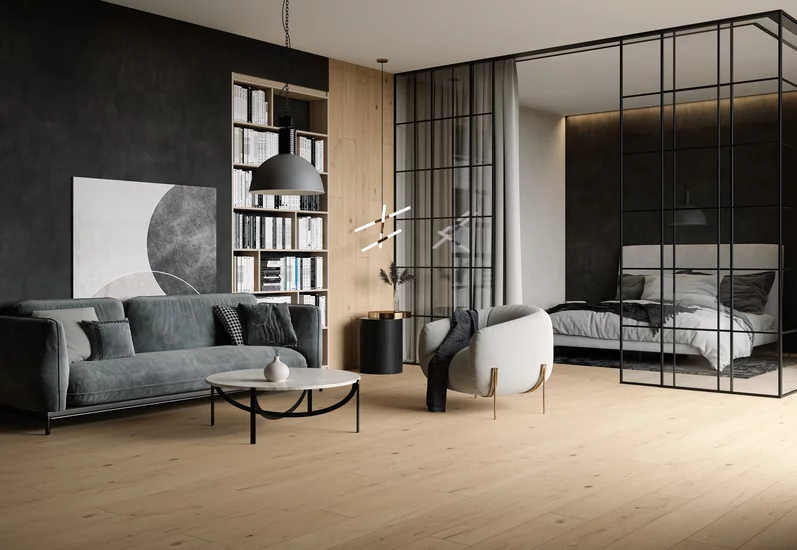 Dla kontrastu w części wypoczynkowej wybierz jasną posadzkę (np. drewnopodobne duże płyty ceramiczne o wyglądzie desek z naturalnego drewna).