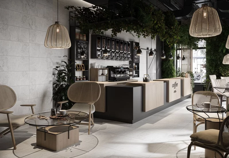 Betonowe szarości i zieleń to oczywiste połączenie, powszechnie występujące w naturze. Dlatego sprawdza się ono również w przestrzeniach zarówno mieszkalnych, jak i publicznych – w restauracjach, recepcjach hotelowych, biurowcach i przychodniach lekarskich.