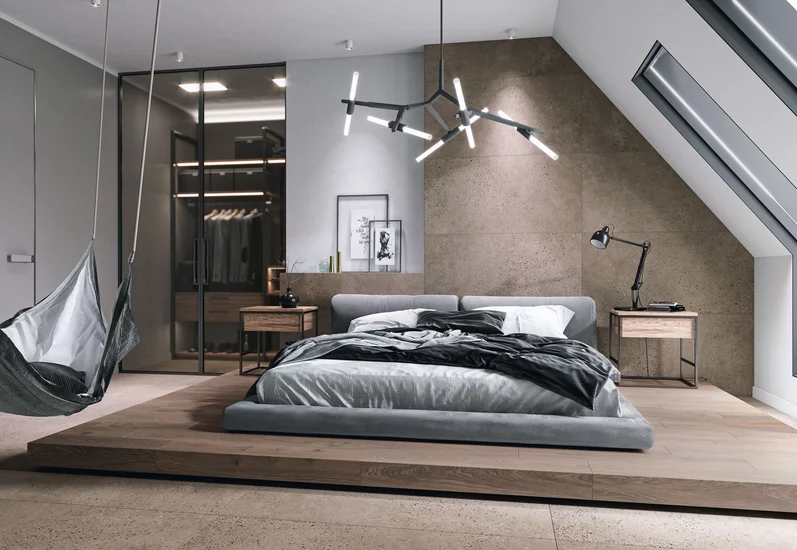 Wnętrza industrialne często kojarzone są z surowością, chłodem i brakiem przytulności. To dlatego tak rzadko możemy je spotkać w sypialniach, czyli miejscu, które z założenia ma być strefą relaksu, odpoczynku i spokoju. Jednak trzymając się kilku prostych zasad, również w sypialni stworzysz industrialne i jednocześnie niezwykle ciepłe miejsce. Jak to zrobić? Postaw na beton, ale w ciepłym kolorze. Płytki ceramiczne, które bardzo autentycznie odwzorowują beton dostępne są nawet w odcieniach taupe, czyli beżu wpadającego w szarość. To zdecydowanie ociepli wnętrze. Do tego elementy drewna i tapicerowane dodatki – łóżko, fotele, narzuty. Nie zapomnij o nowoczesnych, czarnych dodatkach, np. lampach, które dodatkowo wprowadzą do wnętrza ciepłe światło. Gotowe! Industrialne, surowe wnętrza mogą być naprawdę przytulne.