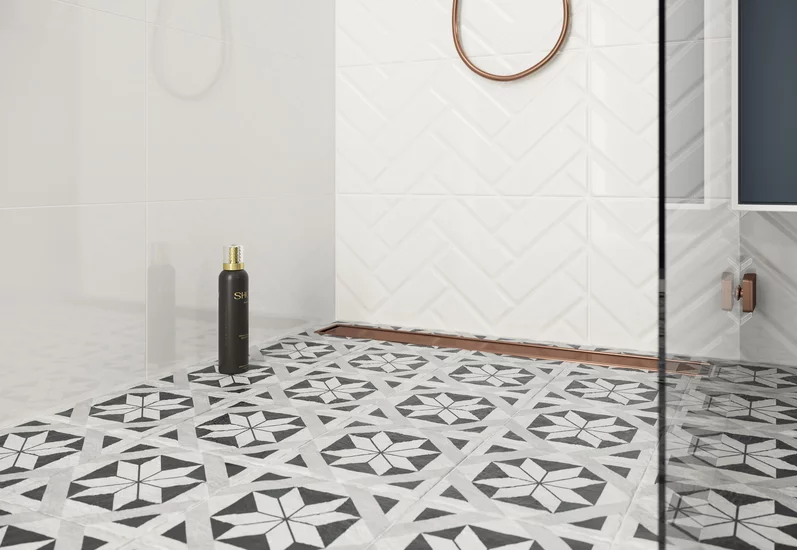 Gdy postawimy na matową biel, zmiękczoną kroplą barwy kremowej i biel schłodzoną odrobiną szarości, w połączeniu z subtelnymi motywami geometrycznymi, wówczas osiągniemy ogólne wrażenie lekkości wnętrza. Gdy dodamy do tego delikatne pastelowe akcenty w postaci wybranych elementów wystroju – np. umywalki czy półek – wówczas zyskamy efekt harmonijnego dopełnienia.