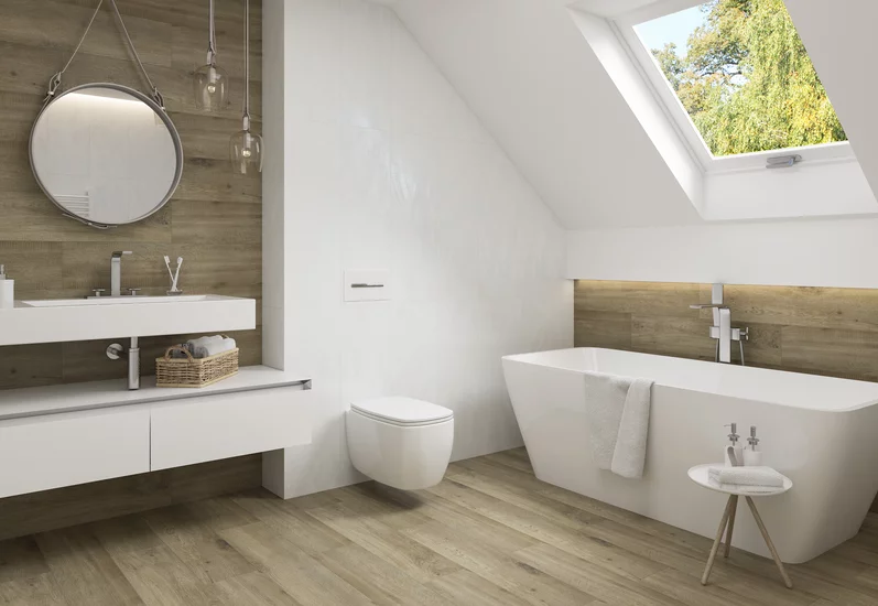 Białe płytki stanowią doskonałe tło dla wszelkich wyrazistych faktur i struktur – zwłaszcza tak efektownych, jak w przypadku drewna. Barwa i słoje ceramicznych desek są wówczas w pełni uwypuklone.
