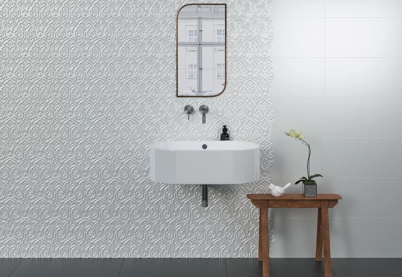 Możliwości technologiczne producentów płytek pozwalają na niemal nieograniczone zabiegi zdobnicze na ceramicznej powierzchni. Stąd popularność białych płytek strukturalnych. Niemal każdą przestrzenną formę, wymyśloną przez designera, można „wyprasować” na powierzchni płytek. Trójkąty, trapezy, koła wypukłe i wklęsłe, a także miękkie formy fal i arabeski – wybór dla klienta jest ogromny.