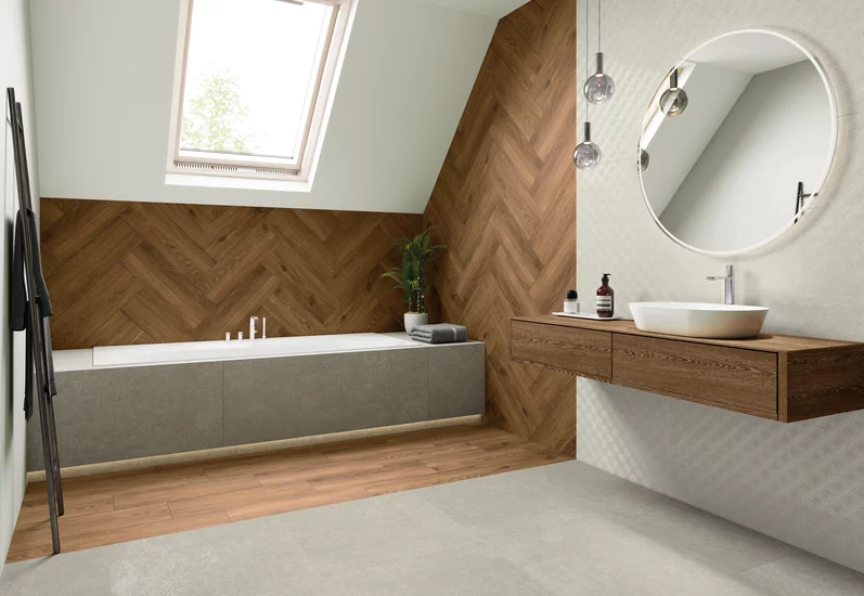 Oczywiście łazienka nie musi być w całości biała Dodatek ceramicznego drewna na podłodze i w wybranych miejscach na ścianach będzie świetnie współtworzył wystrój w stylu nowoczesnym, skandynawskim, eko czy hygge.