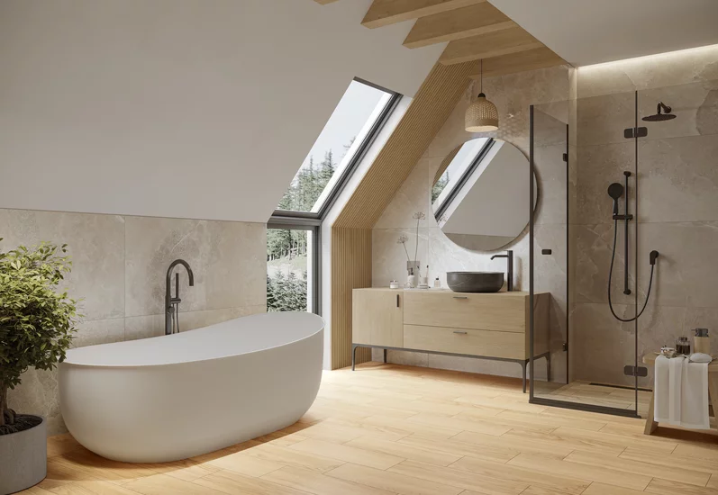 Okno dachowe i jasne płytki to sprawdzony przepis na świetlistą, przyjazną łazienkę.