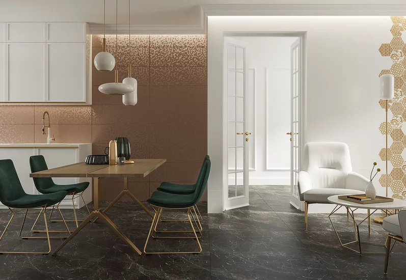 Elegancki styl glamour widoczny na płytkach ściennych w kuchni