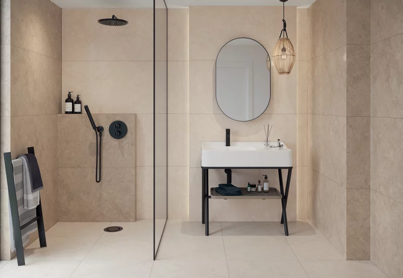wiele możliwości połączenia matowych płytek z innymi elementami wykończenia wnętrz.