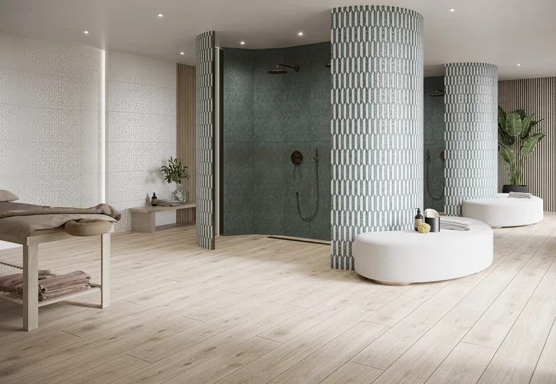 Aby stworzyć wrażenie łazienki inspirowanej morzem, wybierz płytki w odcieniach błękitu i zieleni. Mozaiki mogą być ułożone w sposób przypominający fale lub morskie pejzaże. Okrągłe lub nieregularne kształty płytek dodadzą wnętrzu dynamiki i świeżości, a połączenie różnych odcieni niebieskiego stworzy efekt głębi.