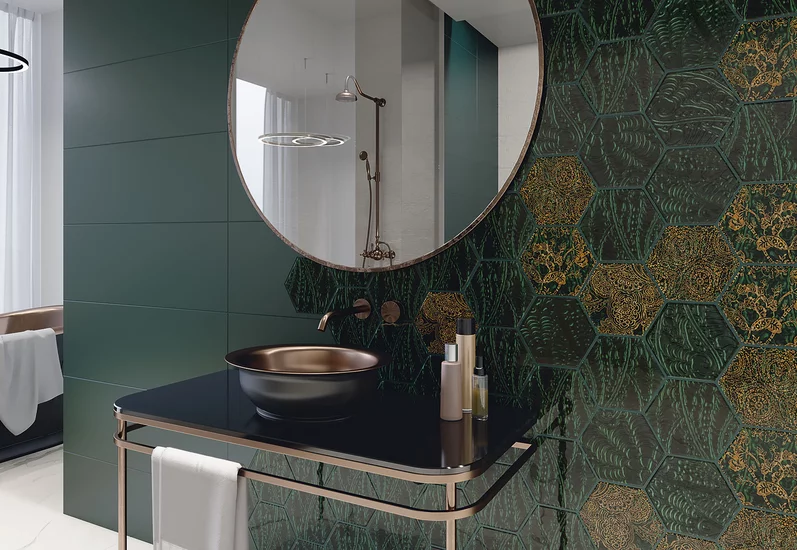 Kolekcja Glitter Mood – to paryska elegancja z lat 20. Heksagonalne płytki w stylu art déco wprowadzają do pomieszczenia wykwintną atmosferę i nanoszą nieco odważniejszego charakteru. Złote wzory połączone z heksagonalnymi ornamentami to kwintesencja francuskiej kamienicy, którą możemy wprowadzić prosto do wnętrza swojej łazienki, salonu czy nawet kuchni.