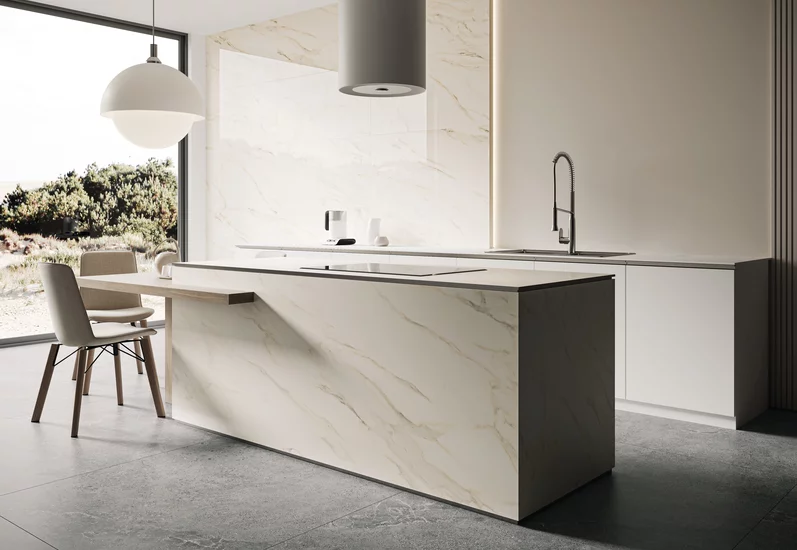Równie duże znaczenia ma sam format płytek. Czy warto sięgnąć po duży rozmiar, gdy kuchnia jest niewielka? Często tak, płytki wielkoformatowe są bardzo modne i dobrze dobrane sprawdzają się także w niewielkich przestrzeniach. Wśród płytek o dużym formacie (120x120 oraz 120x280) warto wyróżnić kolekcję Passion, której grafika z żyłami marmuru doskonale sprawdzi się w zastosowaniach kuchennych, w których naturalny kamień nie jest dobrym wyborem. Płytki o wyglądzie marmuru idealnie oddają piękno kamienia jednocześnie posiadając lepsze walory użytkowe. Z kolekcją Passion wprowadzisz element luksusowego wystroju do swojego wnętrza.
