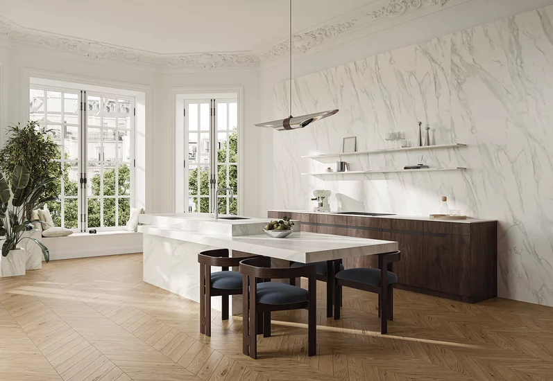 Planowanie białej kuchni z marmurem może być skomplikowane, szczególnie jeśli chodzi o dobór odpowiednich materiałów. Choć marmur jest piękny, jako naturalny kamień jest też wymagający i może łatwo ulec uszkodzeniom. Jego wysoka porowatość sprawia, że może być podatny na plamy i zarysowania, dlatego nie do końca dobrze sprawdza się w kuchni. Lepszym rozwiązaniem mogą być spieki kwarcowe i płytki ceramiczne z kolekcji Horizon od Ceramiki Paradyż - inspirowanej naturalnym kamieniem Calacatta. Są niezwykle wytrzymałe i łatwe w utrzymaniu czystości. Zyskujemy więc praktyczne zalety zachowując wygląd marmuru.