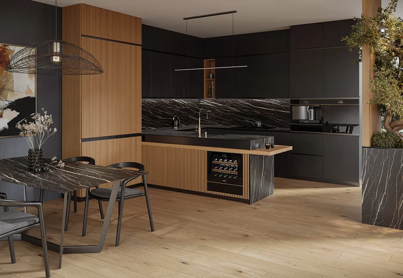 Kuchnia w włoskim stylu to nie tylko estetyka, ale przede wszystkim podejście do życia – ciepło, gościnność i pasja do gotowania. Otwartość ta przejawia się w otwartych szafkach, obecnością świeżych ziół oraz wiele przestrzeni roboczej do wspólnego przygotowywania potraw. Dlatego doskonałym rozwiązaniem są spieki kwarcowe TRI-D, z których cały blat może być bezpieczną i trwałą przestrzenią roboczą. Można pod nim “ukryć” płytę indukcyjną, dzięki czemu obszar ten będzie jeszcze większy.