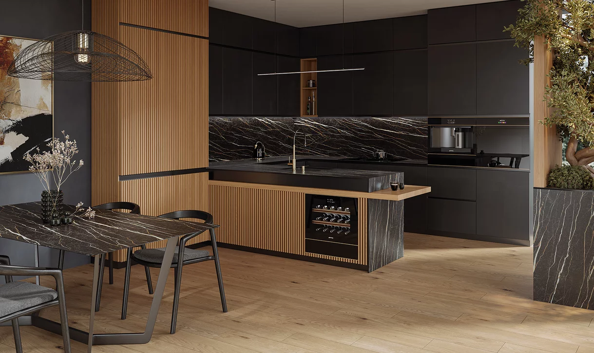 Wyspa kuchenna to niezwykle uniwersalne rozwiązanie. Przygotowywanie posiłków, szybka kawa czy rozpakowywanie zakupów - to jedne z najbardziej oczywistych czynności na tej powierzchni. Dlatego warto zainwestować w blat ze spieków kwarcowych TRI-D, który będzie trwały, odporny na zarysowania, plamy i promieniowanie UV oraz designersko spójny z płytkami na podłodze czy ścianie.