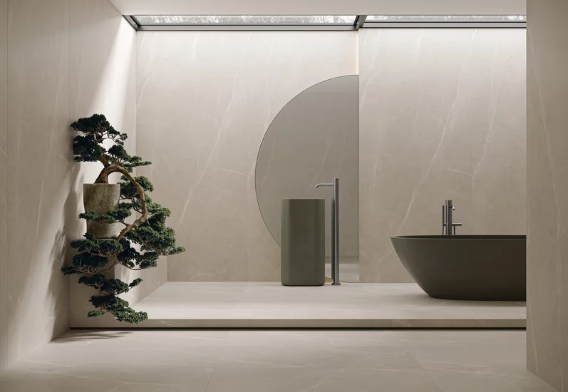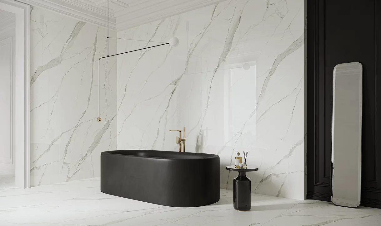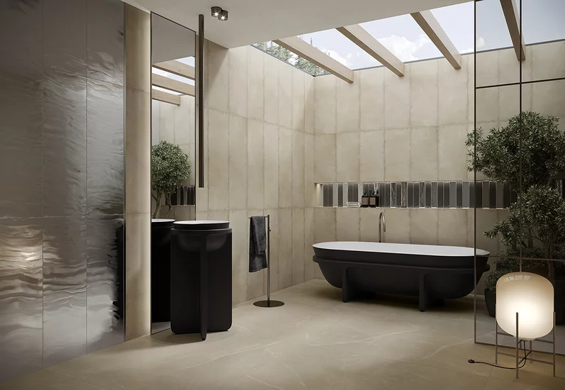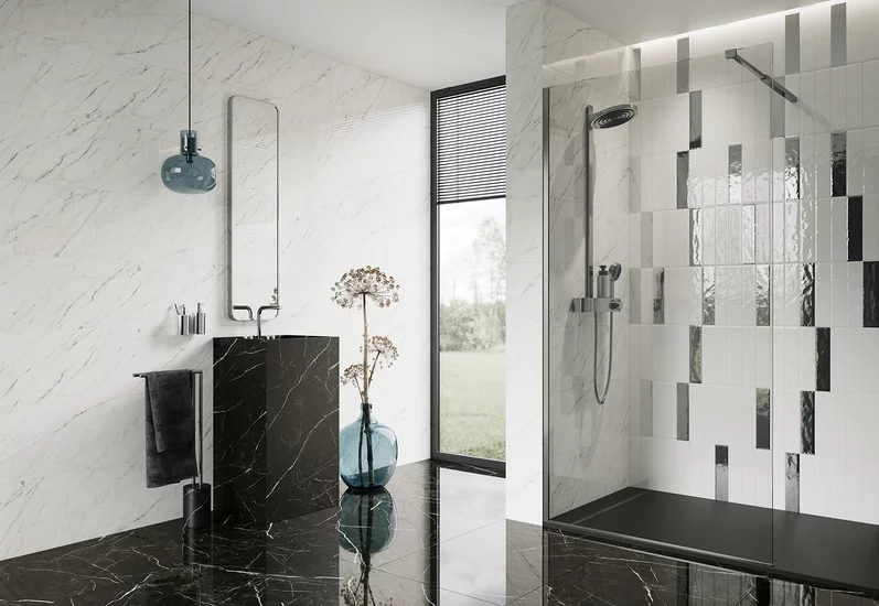 Klasyczne połączenie czerni z bielą pozostaje niezmiennie popularne, tworząc ponadczasową i elegancką kompozycję. Białe płytki stanowią neutralne tło, które pozwala wyeksponować czarne elementy armatury. Białe płytki łatwo dobrać na przykład z kolekcji ARCHITEQ, PASSION czy MONPELLI. Z kolei wprowadzenie akcentów drewnianych może złagodzić kontrast i nadać wnętrzu przytulności.
