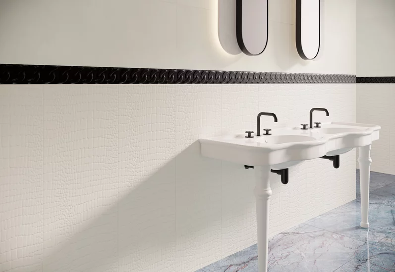 Umiejętne połączenie białych i czarnych płytek pozwala stworzyć dynamiczne i przyciągające wzrok wnętrze. Różnorodność dostępnych formatów i wzorów otwiera szerokie możliwości kreowania unikalnych kompozycji, które nadadzą łazience indywidualny charakter i niepowtarzalny styl. Kolekcja Calacatta daje możliwość tworzenia różnorodnych układów dzięki płytkom dostępnym w wielu formatach. Sprawdzonym rozwiązaniem jest wykorzystanie białych płytek jako podstawy aranżacji, a czarnych jako przemyślanych akcentów w strategicznych miejscach. Taka kompozycja wprowadza do wnętrza elegancję i zapobiega poczuciu przytłoczenia ciemnymi kolorami.