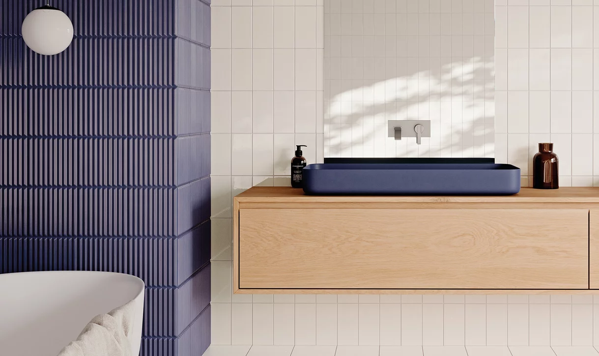 Paleta niebieskiego oferuje niezwykle szerokie możliwości aranżacyjne. Granat, jako kolor pełen głębi, szczególnie dobrze prezentuje się w przestronnych łazienkach. W połączeniu z białymi elementami tworzy klasyczne, kontrastowe zestawienie. Granatowe płytki w towarzystwie białych mebli tworzą nowoczesną, wyrafinowaną kompozycję. Może ona być jeszcze bardziej widowiskowa i urozmaicona, dzięki płytkom strukturalnym Monpelli. Te hipnotyzujące, podłużne struktury o efekcie “negatywu” pozwolą na stworzenie wręcz dekoracyjnej powierzchni, która dzięki grze światła i cienia będzie zachwycała w inny sposób w zależności od pory.