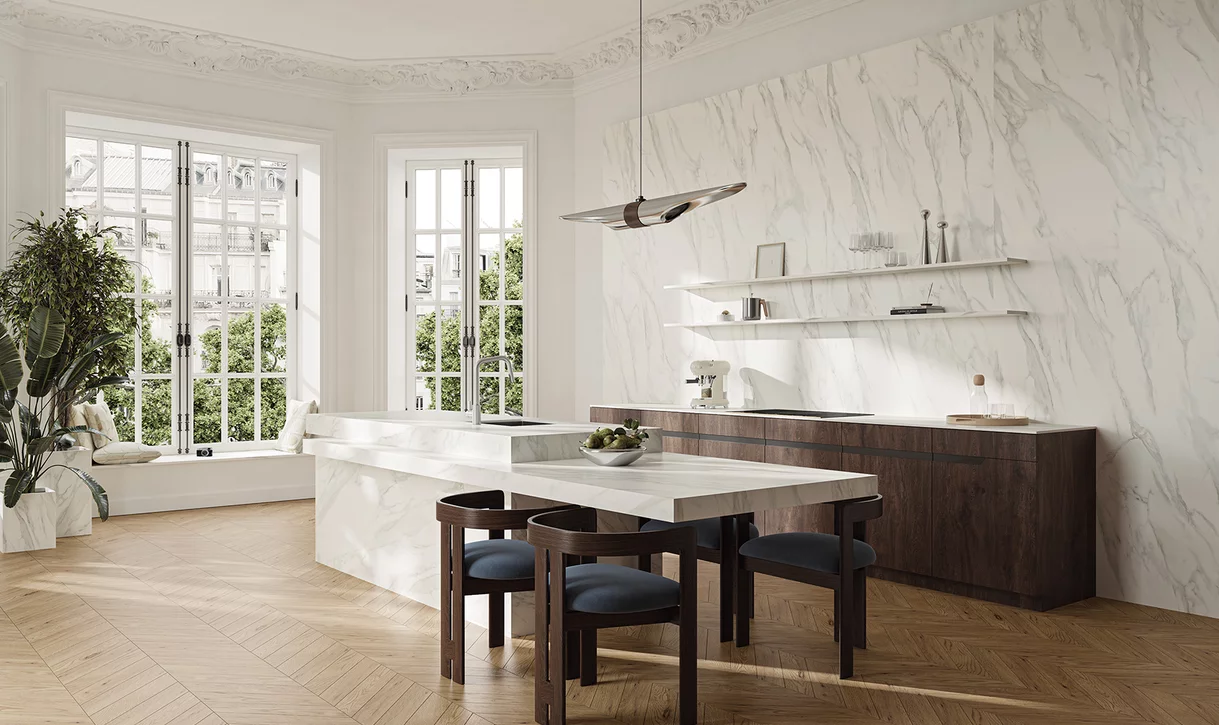 Równie istotną rolę odgrywa także stylistyka kamienia, zwłaszcza marmuru, która przeniesiona została na nowoczesny materiał - spiek kwarcowy. Kolekcja Horizon TRI-D Gold stanowi przykład idealnego połączenia walorów estetycznych z praktycznymi. Ciepłe odcienie i delikatne żyłkowanie nadają wnętrzu luksusowego charakteru.