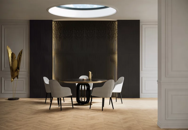 Paleta barw w angielskim salonie to spokojne, eleganckie odcienie: beże, brązy, oliwkowa zieleń, burgund oraz granat. Ściany malowane na jasne, neutralne tony stanowią doskonałe tło dla ciemnych mebli i dekoracji. Świetnym rozwiązaniem może być także zielona płytka nawiązująca do sztukaterii z kolekcji Green Philosophy.