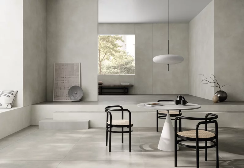 Stylistyka loft to nie tylko moda czy odzwierciedlenie statusu związanego z wielkokubaturowymi przestrzeniami. Jest to przede wszystkim wolność, nowoczesność oraz minimalizm, który pozwala odetchnąć od codziennego przebodźcowania. Ważne jest, aby aranżacja była spójna i jedynie uzupełniona ważnymi, bardzo indywidualnymi akcentami oraz dodatkami. Dlatego warto postawić na identyczne wzornictwo na tzw. slabach, czyli płytkach o wymiarach 280x120 cm, płytkach podłogowych i spiekach kwarcowych idealnych do tworzenia blatów kuchennych czy parapetów.