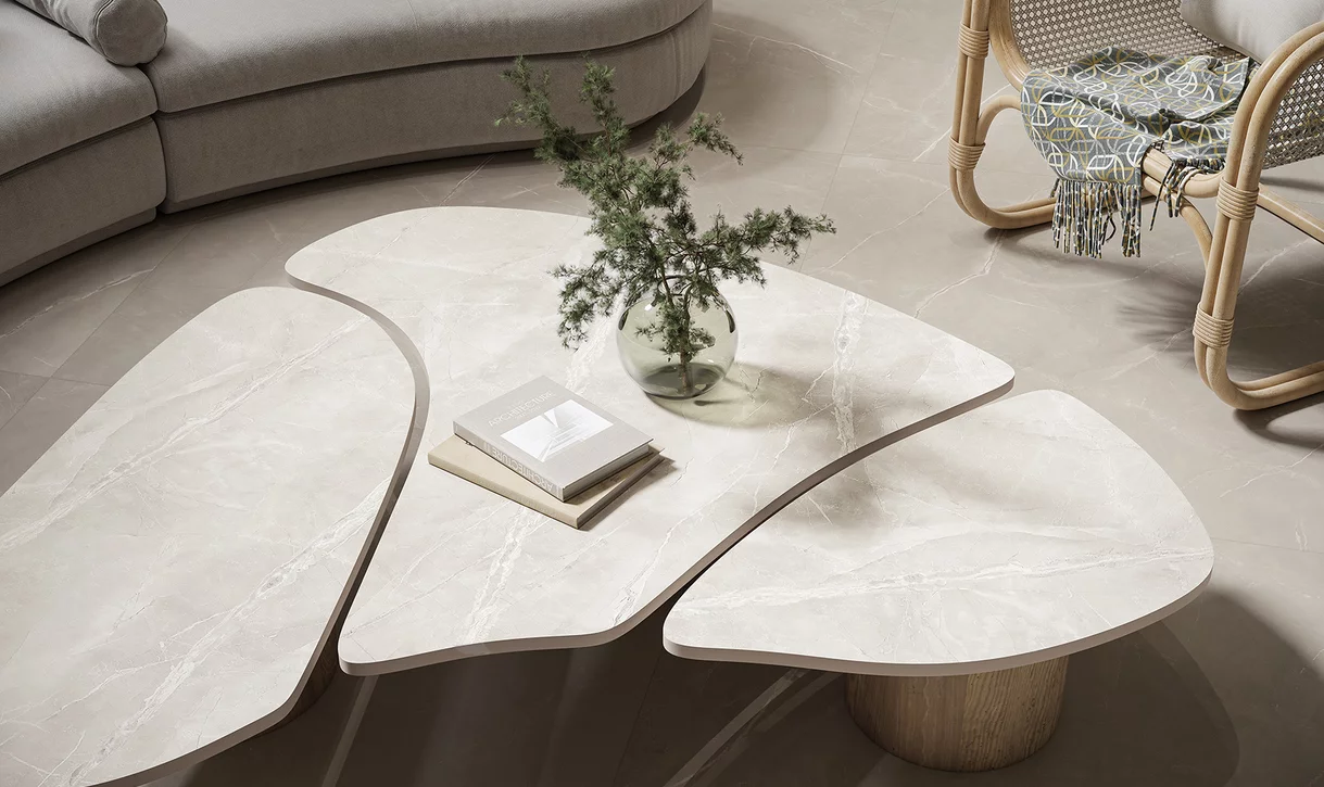 Przemyśl materiały wykończeniowe ścian i podłóg. W strefie reprezentacyjnej doskonale sprawdzi się spiek kwarcowy Ritual TRI-D Taupe, łączący naturalność kamienia z nowoczesnymi parametrami technicznymi. Jego ciepłe odcienie taupe i delikatne żyłkowania inspirowane kamieniem pulpis idealnie wpisują się w estetykę modern classic, nadając przestrzeni elegancki charakter.