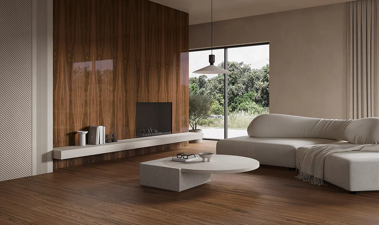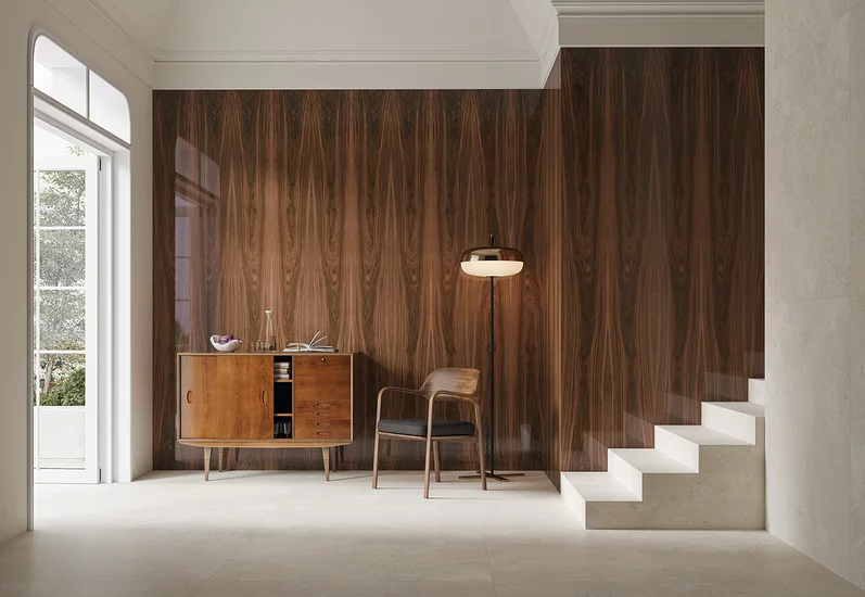 Jedną z ikon wspomnianych dekad są forniry. Kolekcja Woodfor z najnowszej współpracy marki PARADYŻ z Gosią Baczyńską to elegancki i dojrzały rysunek słojów orzecha kalifornijskiego na płytkach o wymiarach nawet 120x280 cm. Charakterystyczne okładziny ścienne przestronnych pomieszczeń nie tylko gmachów, powróciły w praktycznej postaci płytek ceramicznych.