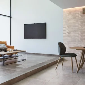 Nowoczesna przestrzeń dzienna z dużymi płytkami inspirowanymi kamieniem z kolekcji Infinity i jasną sofą.