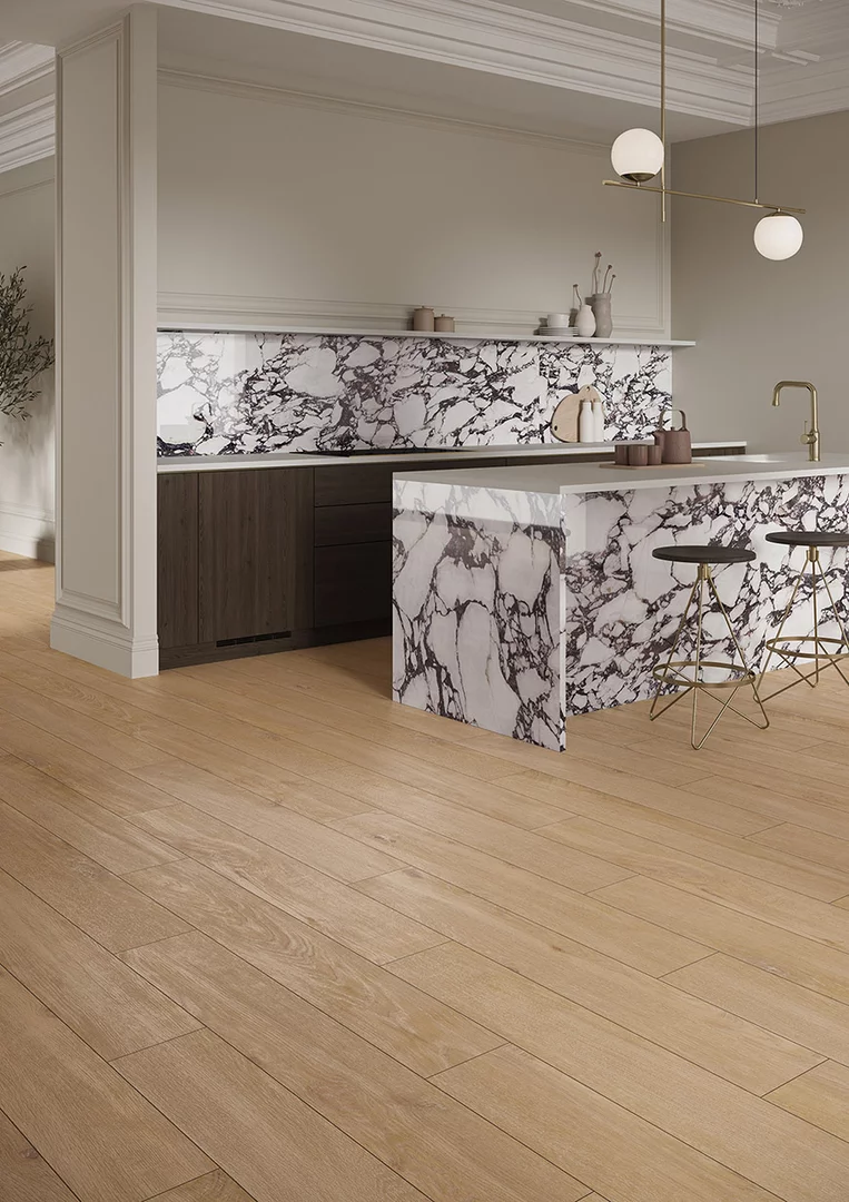 Mocne, odważne i oryginalne wzornictwo oparte na wyrazistych barwach najlepiej charakteryzuje ten zjawiskowy wzór. Został zainspirowany naturalnym, unikatowym kamieniem Calacatta Viola, wyróżniającym się żyłkami o zróżnicowanej grubości i dynamice, w niezwykle modnych odcieniach fioletu. Połączenie śnieżnobiałych elementów z intensywnymi kolorami pozwoliło uzyskać prawdziwie spektakularny efekt. Intrygująca grafika dodała prestiżu ponadczasowej estetyce marmuru, a także stworzyła aurę pełną klasy i wyrafinowania. Efekt głębi i przestrzenności wzoru został dodatkowo wzmocniony poprzez zastosowanie polerowanej powierzchni.