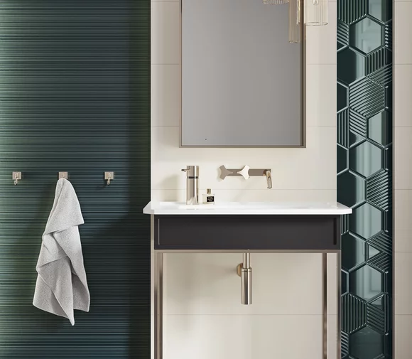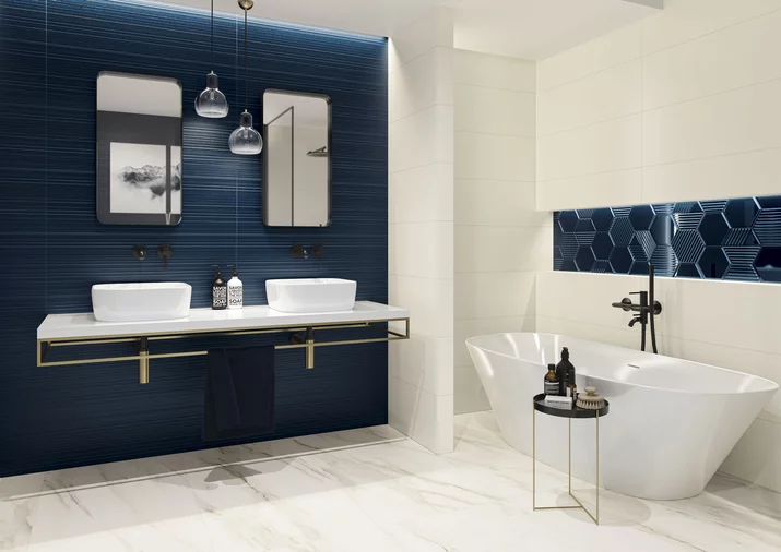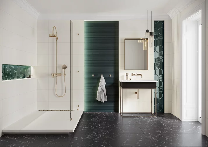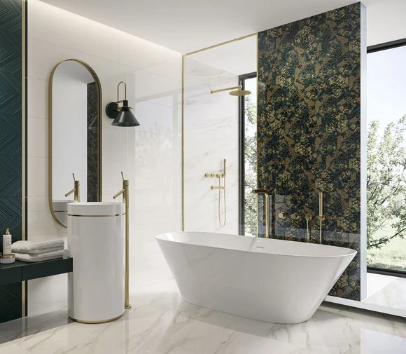 Poszukujesz rozwiązań, dzięki którym stworzysz niepowtarzalne i wyraziste wnętrza? Postaw na nasycone barwy i wybierz wśród różnorodnych dekorów. Kolekcji Intense Tone przywoła na myśl klimat karnawału w Wenecji - głębokie kolory, oprawione w złote ornamenty inspirowane haute couture. Głęboki granat i ciemną zieleni płytek dopełni struktura ponadczasowych pasów oraz klasycznej jodełki. Jeśli chcesz stworzyć jeszcze bardziej unikalną aranżację, postaw na metaliczne listwy lub na dekorowane szlachetnym złotem szklane inserta.