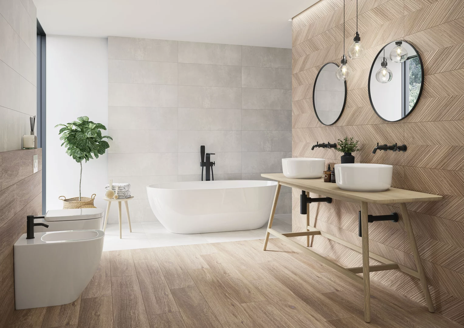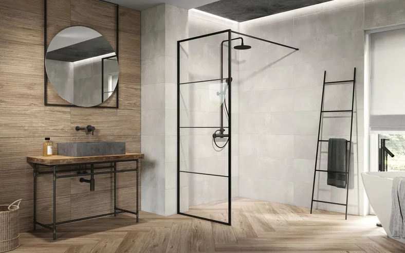 Nowoczesna łazienka z płytkami drewnopodobnymi z kolekcji Wood love oraz płytkami imitującymi beton na ścianach.
