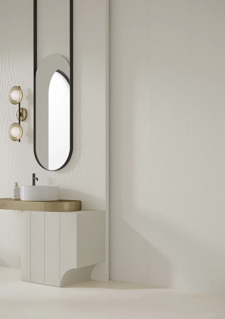 Минималистичная коллекция ослепительно белой настенной плитки с деликатной, матовой отделкой украшена органическими структурами. Деревянные волокна с эффектом bookmatch, пористый, но утончённый бетон, а также камень — подобно лунной поверхности, усеянной нерегулярными углублениями, — образуют интригующие структуры. Плитка придаст элегантность и современный стиль любому пространству, а декоративный эффект может быть усилен за счёт правильно подобранного освещения.