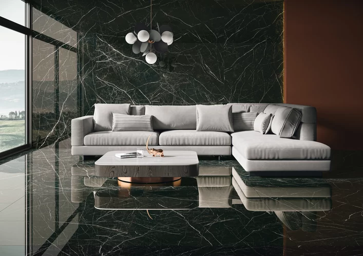 DESIRE – это коллекция напольной и настенно-напольной плитки, вдохновленная камнем. Крупноформатная плитка из набора Monumental из черного мрамора с белыми прожилками предназначена для использования в ванных комнатах, кухнях и гостиных, на террасах, холлах, фасадах, а также в инвестиционных объектах (например, в приемной гостиницы). Плиты формата 60x120 см, 120x120 см и 120x280 см.
